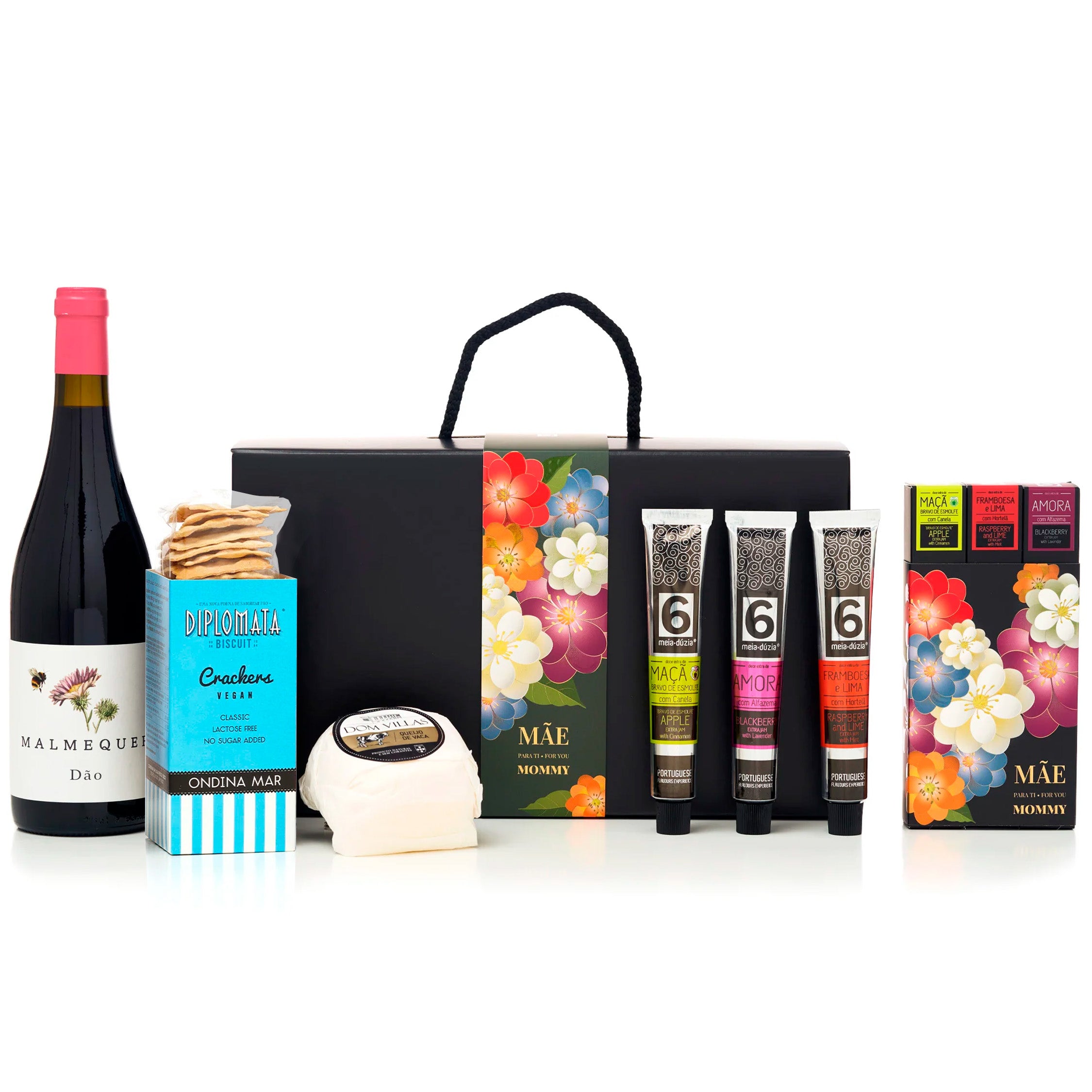 Para mães que gostam de mesa, de partilha e de receber a família, este cabaz é um presente completo e emocional. Inclui o PACK 3 Sabores “Para Ti Mãe” (com Maçã Bravo de Esmolfe com canela, Amora com alfazema e Framboesa e lima com hortelã), crackers, queijo amanteigado, vinho tinto do Dão e ainda um postal com mensagem personalizada. É um presente que traduz cuidado em forma de experiência.