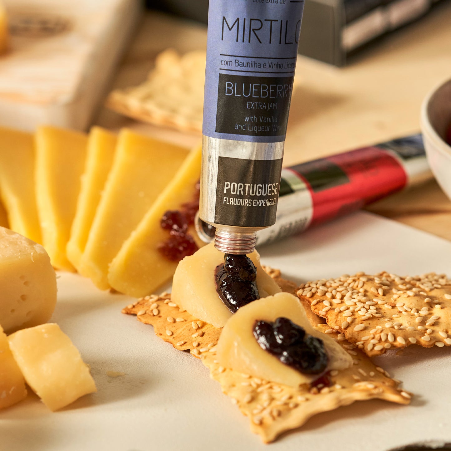 Acompanha bem com queijos curados ou queijos frescos. Ver recomendações de cada sabor no tubo.