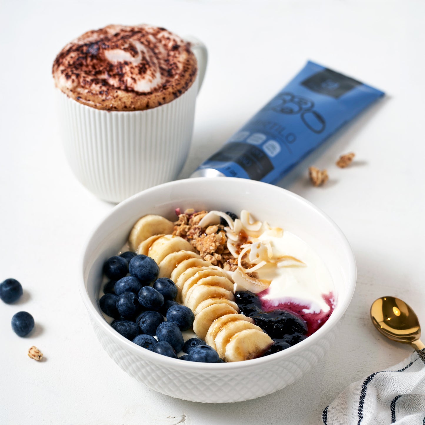 Blueberry (55%), sugar, melissa (1%), gelling agent (pectin) and acidity regulator (citric acid). Prepared with 55g of fruit per 100g.
