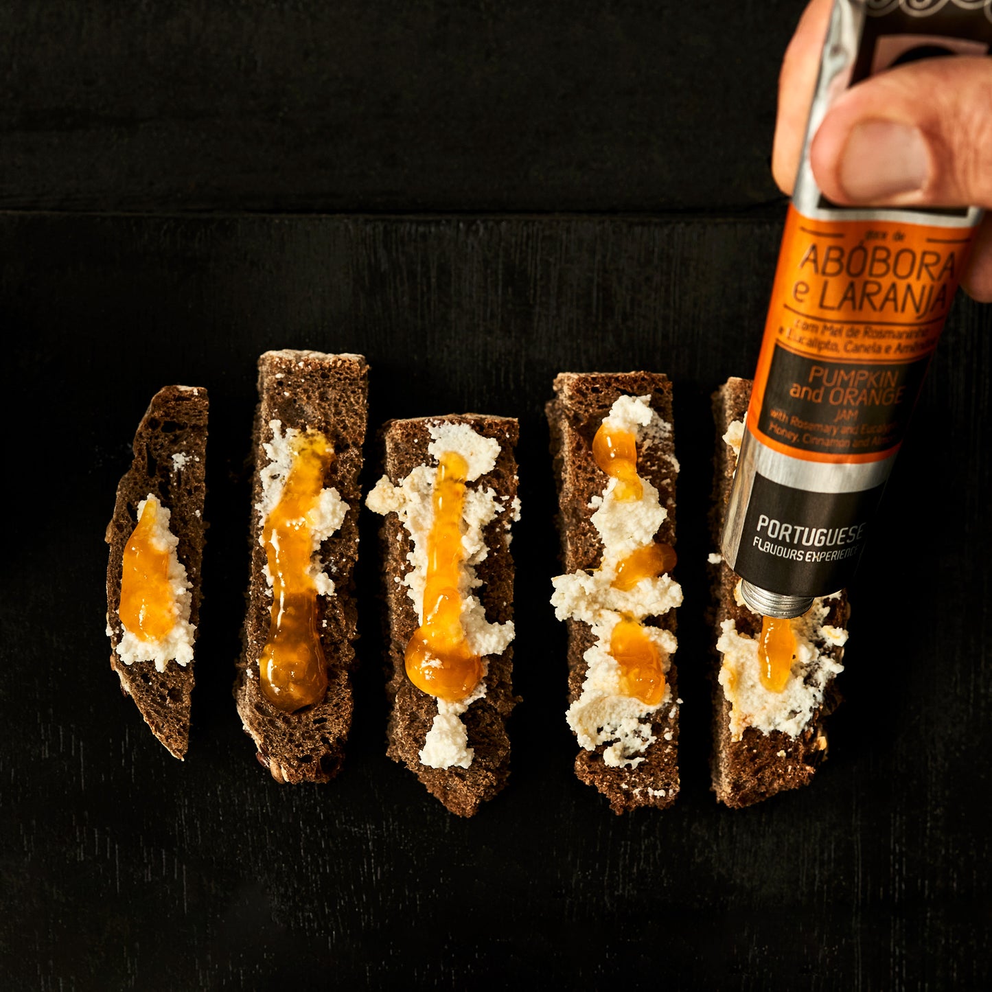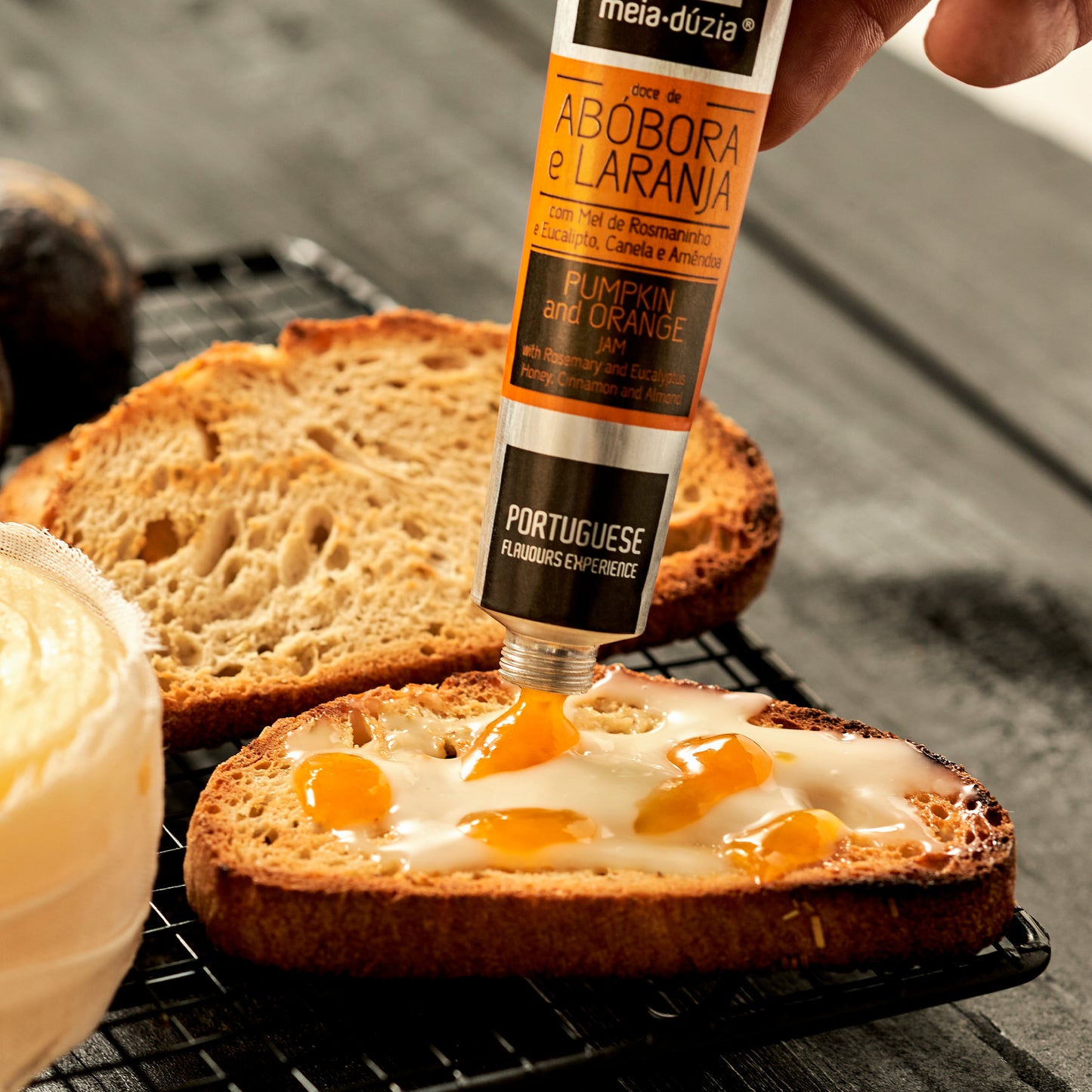 - Smoked salmon and cottage cheese toast with pumpkin and orange jam with cinnamon and almonds meia.dúzia® - Chef Álvaro Costa