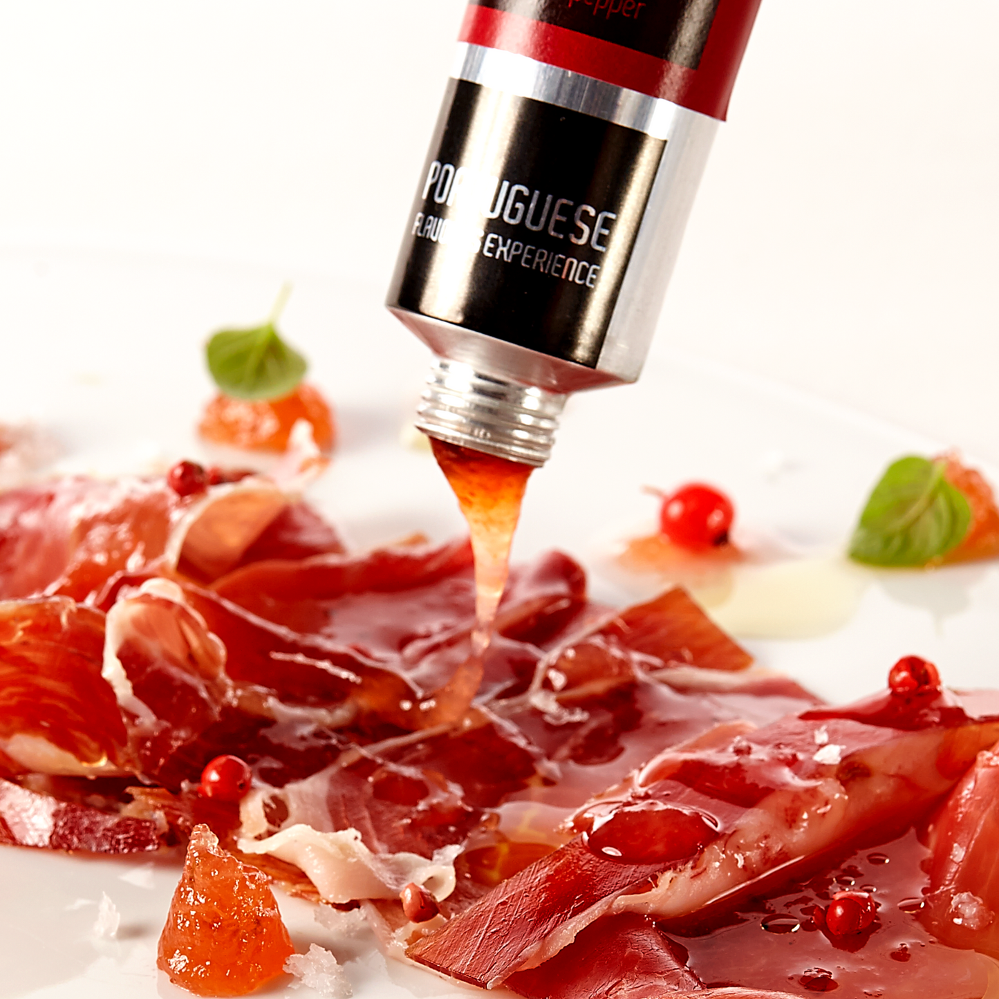 - Combinação com queijos intensos: sirva com queijo azul (Roquefort, Stilton, Gorgonzola) ou queijo de cabra curado sobre tostas crocantes. A doçura da pêra, o toque ácido da groselha e a leve picância da pimenta rosa criam uma harmonia de sabores única.