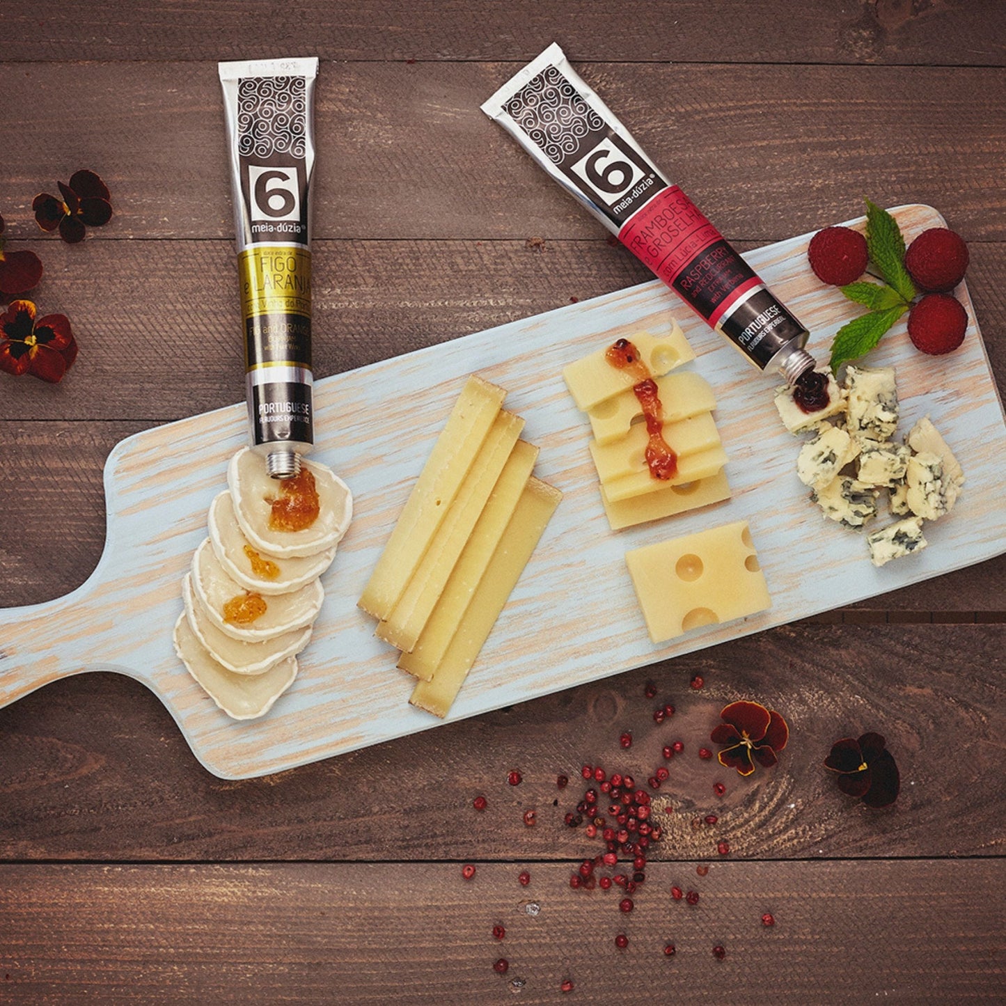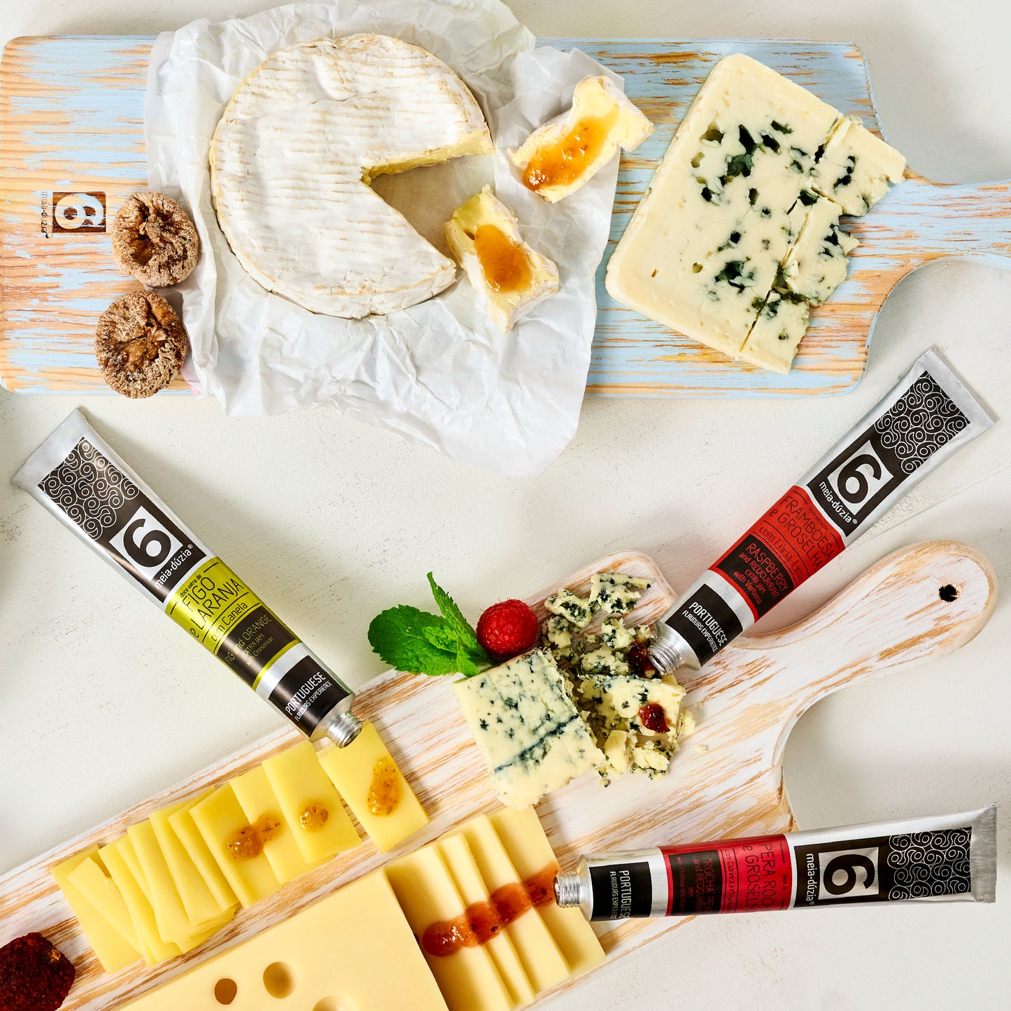 Tábua de queijos franceses com compota artesanal de figo e laranja com vinho do Porto e compota artesanal de framboesa e groselha com lúcia-lima meia.dúzia