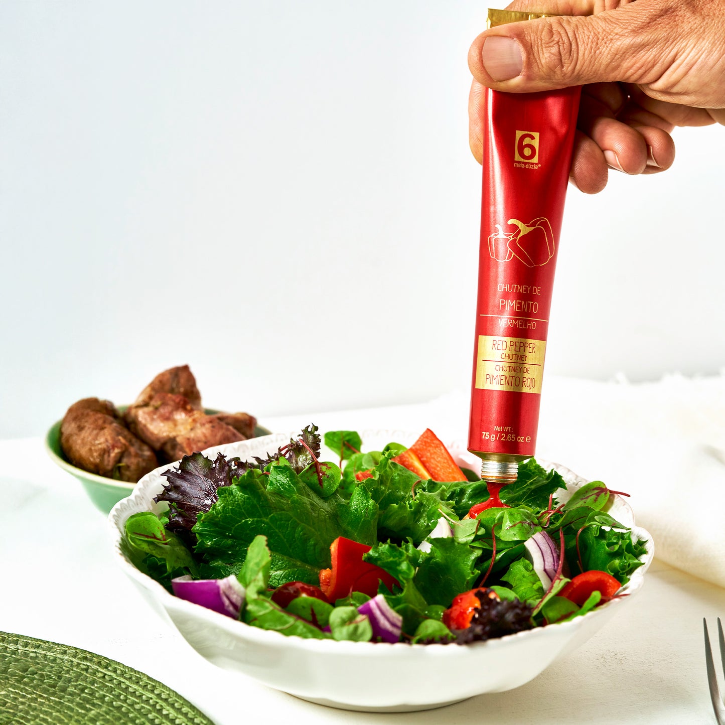 Inspirado nas hortas portuguesas, este chutney de pimento vermelho junta a doçura natural deste vegetal ao toque agridoce e ligeiramente picante de especiarias selecionadas. Versátil, fresco e aromático, é ideal para acompanhar carnes assadas, aves, enchidos tradicionais ou queijos fortes, como o de cabra curado. Também funciona como complemento de pratos vegetarianos ou como topping criativo em saladas. Um condimento que homenageia a cozinha portuguesa ao reinventar um ingrediente simples em algo sofisticado.