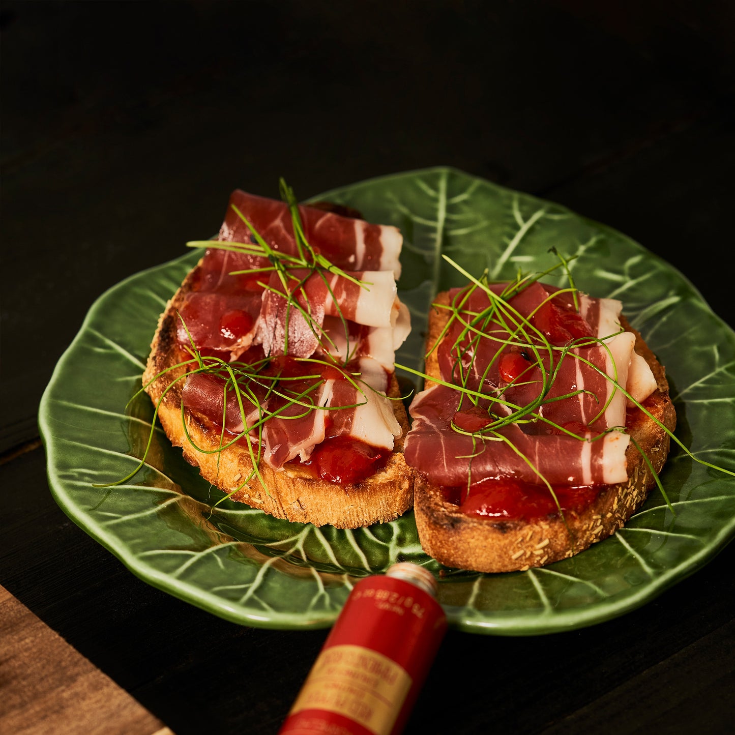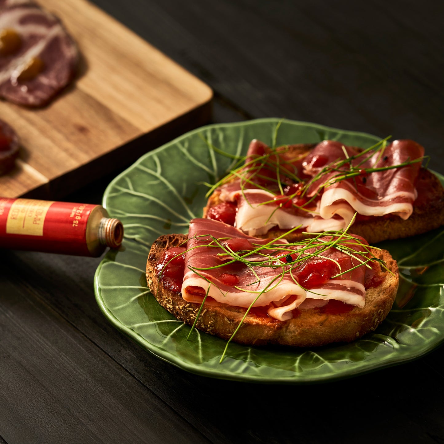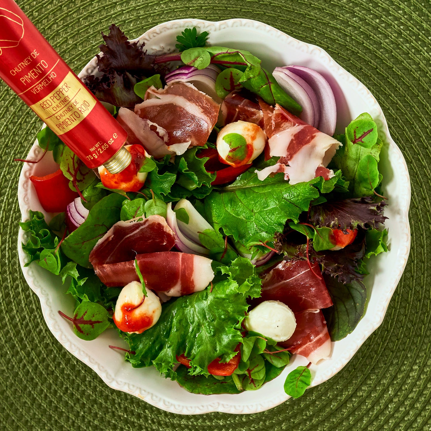 - Presunto de Chaves ou presunto alentejano: O chutney aplicado diretamente sobre as fatias cria contraste agridoce com o salgado da cura.