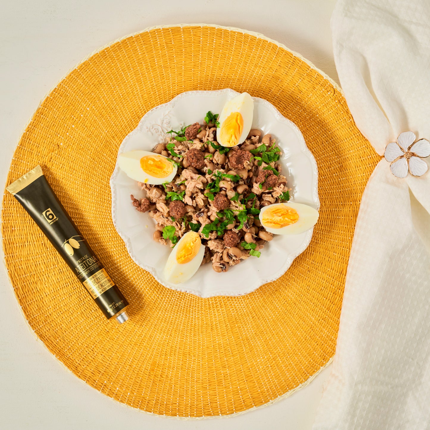 - Salada fresca de bacalhau desfiado: A pasta acrescenta notas mediterrânicas e frutadas que elevam o prato tradicional.