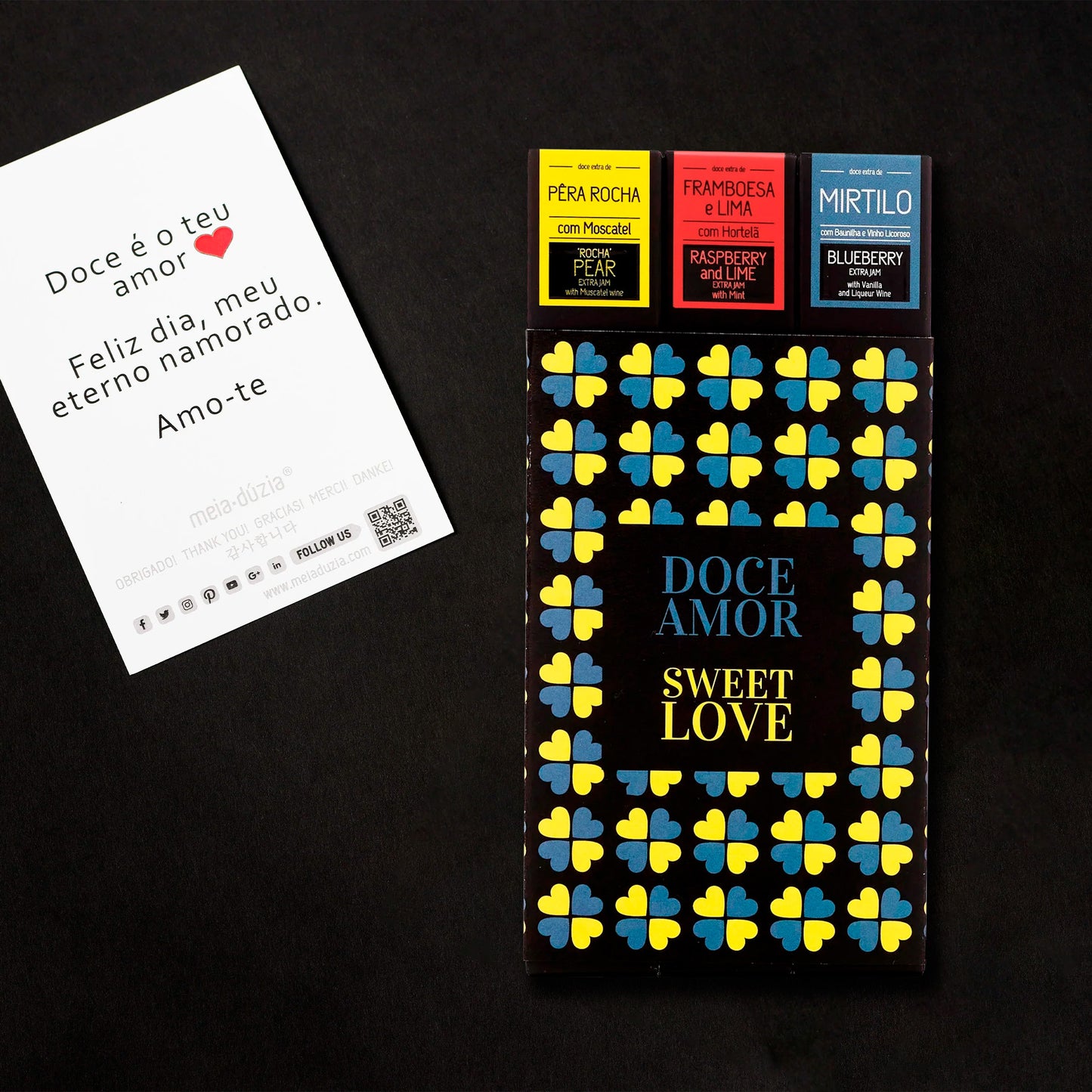 Este pack reúne doces artesanais portugueses e chocolate que exploram diferentes facetas do amor: da frescura à profundidade, da leveza à intensidade. Cada sabor foi pensado para criar uma experiência equilibrada, marcante e memorável.